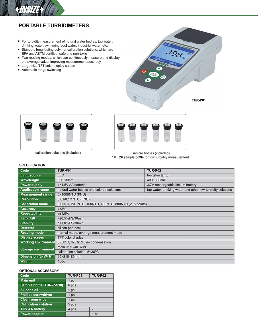 TUR-P02 turbidity 0~1000NTU (FNU) ≤±8% 400~600nm