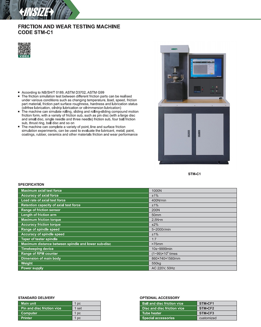The friction simulation test between different friction parts can be realised under various conditions such as changing temperature, load, speed, friction part material, friction part surface roughness, hardness and lubrication status (oil-free lubrication, oil-drip lubrication or oil-immersion lubrication)