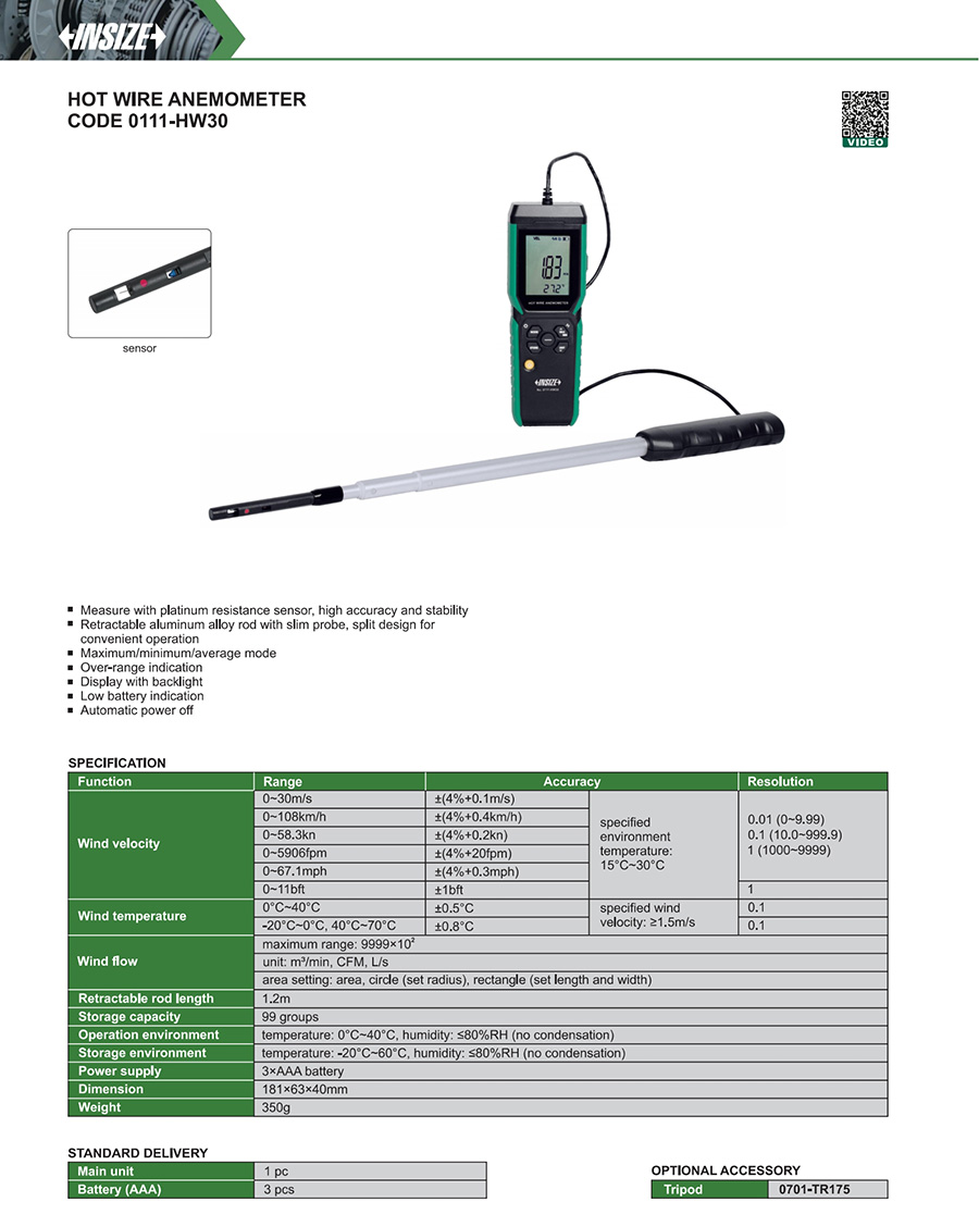 | 0111-HW30 | 0~5906fpm | ±(4%+20fpm) | 0.01, 0.1, 1 | Wind velocity |