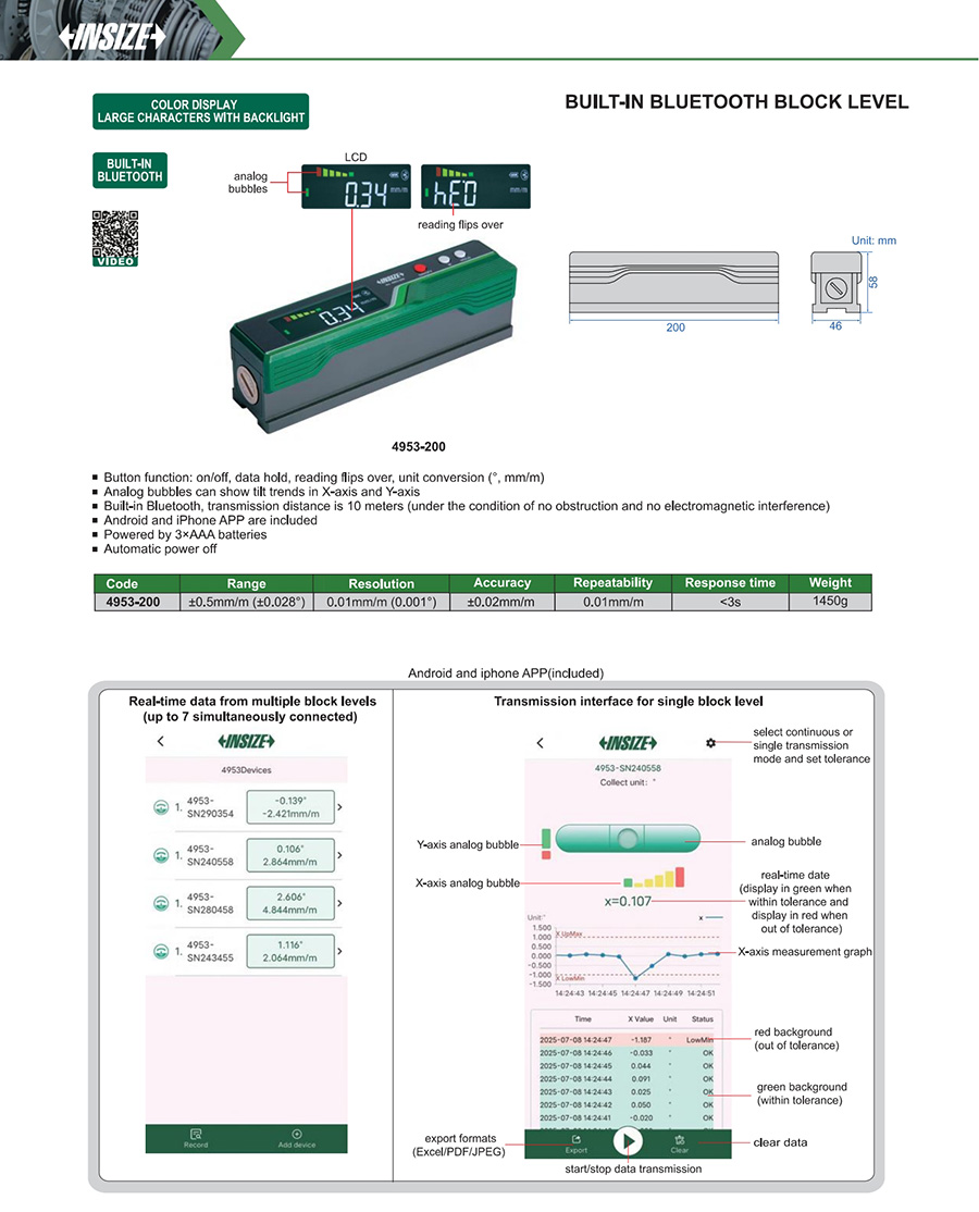 4953-200 ±0.5mm/m (±0.028°) ±0.02mm/m 0.01mm/m (0.001°) 0.01mm/m yes