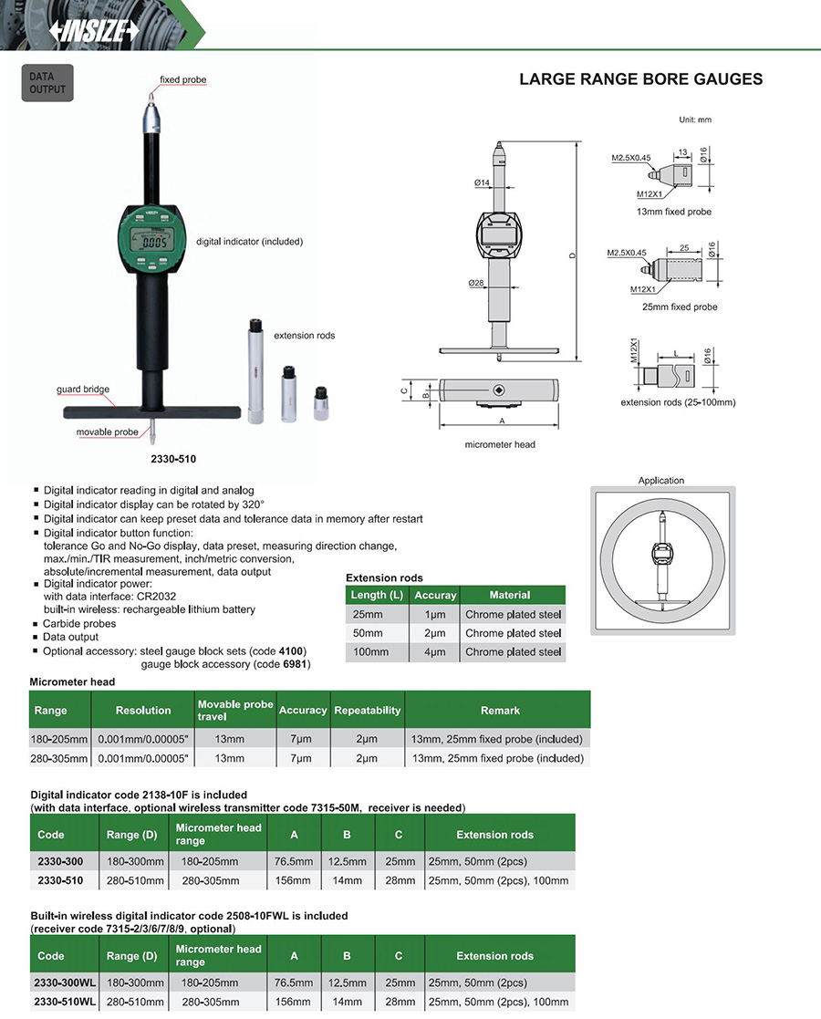 Digital indicator button function: tolerance Go and No-Go display, data preset, measuring direction change, max./min./TIR measurement, inch/metric conversion, absolute/incremental measurement, data output