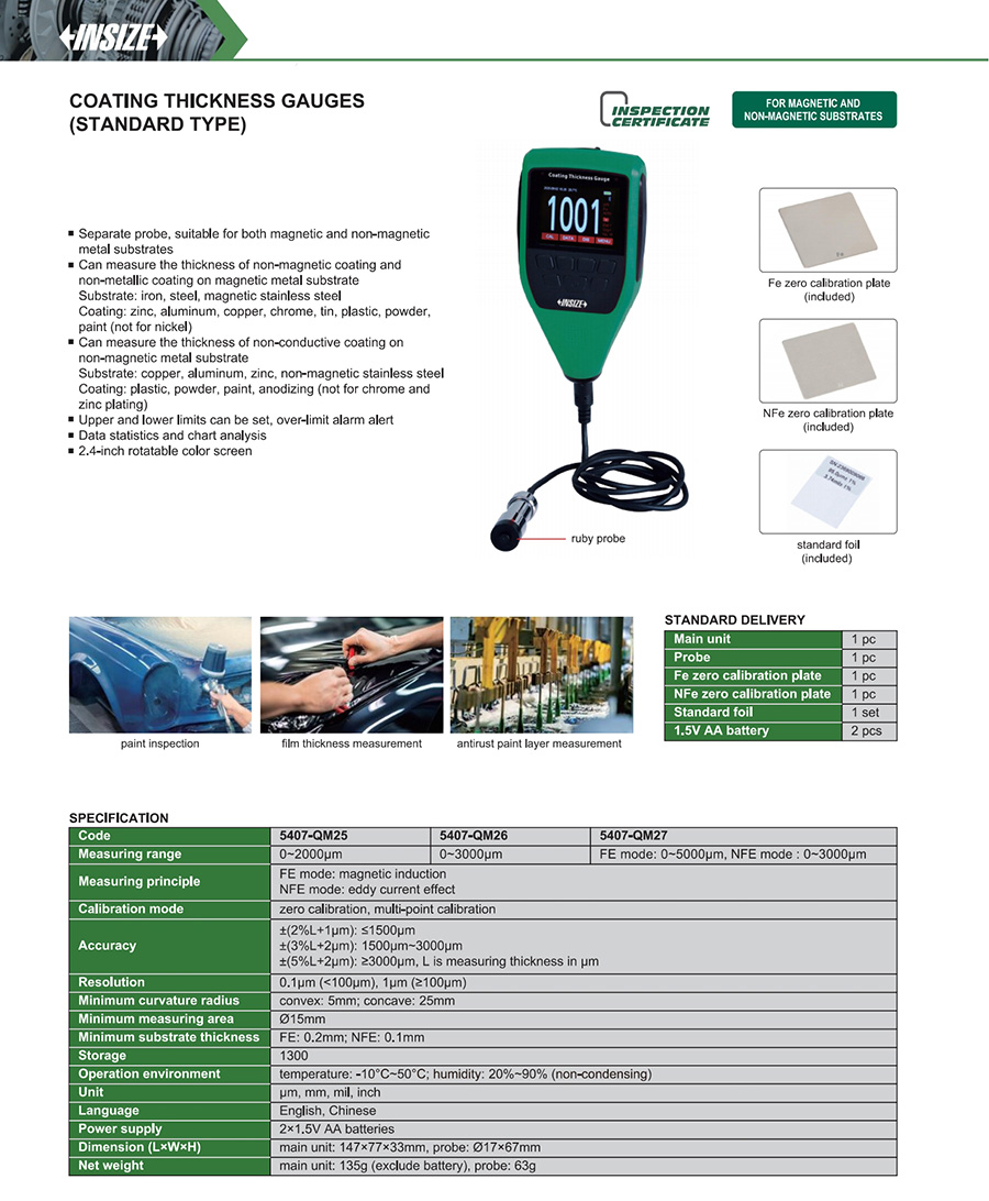 5407-QM27 FE mode: 0~5000μm, NFE mode : 0~3000μm ±(2%L+1µm): ≤1500µm, ±(3%L+2µm): 1500µm~3000μm, ±(5%L+2µm): ≥3000μm 0.1μm (<100μm), 1μm (≥100μm) no