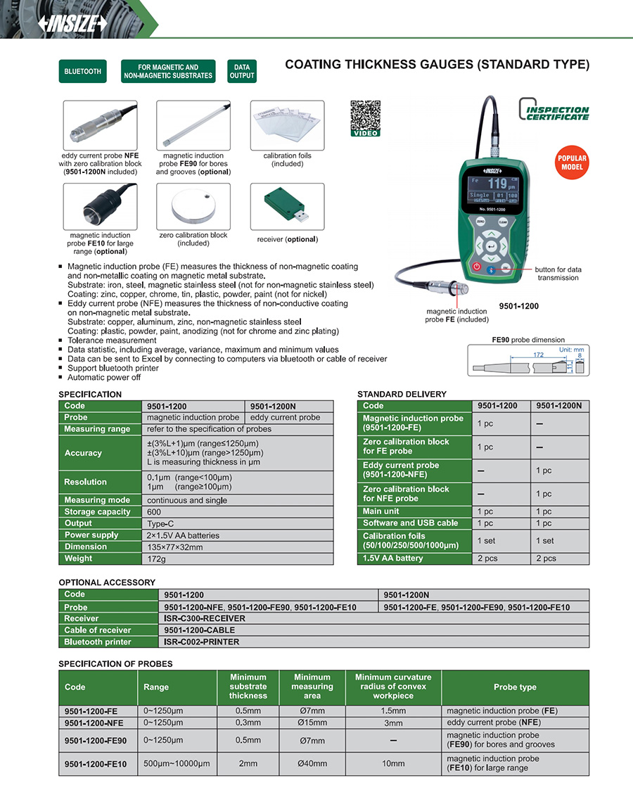 9501-1200N 0~1250μm ±(3%L+1)μm (range≤1250μm), ±(3%L+10)μm (range>1250μm) 0.1μm (range<100μm), 1μm (range≥100μm) Type-C