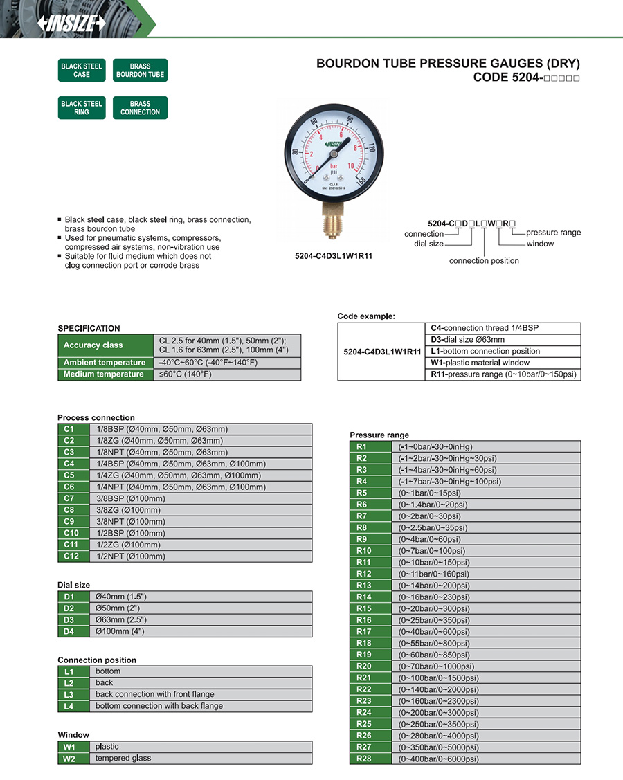 5204 1/8BSP, 1/8ZG, 1/8NPT, 1/4BSP, 1/4ZG, 1/4NPT, 3/8BSP, 3/8ZG, 3/8NPT, 1/2BSP, 1/2ZG, 1/2NPT Ø40mm, Ø50mm, Ø63mm, Ø100mm bottom, back, back connection with front flange, bottom connection with back flange plastic, tempered glass