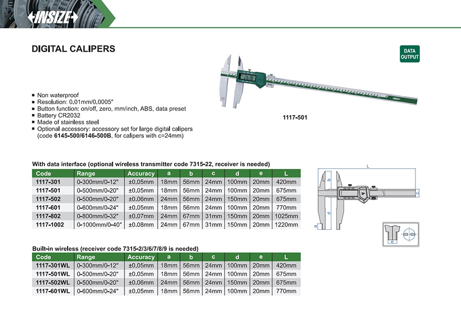 1117-501 0-500mm/0-20" ±0.05mm 0.01mm/0.0005" with data interface