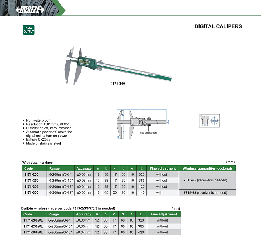 | 1171-306WL | 0-300mm/0-12" | ±0.04mm | 0.01mm/0.0005" | built-in wireless |