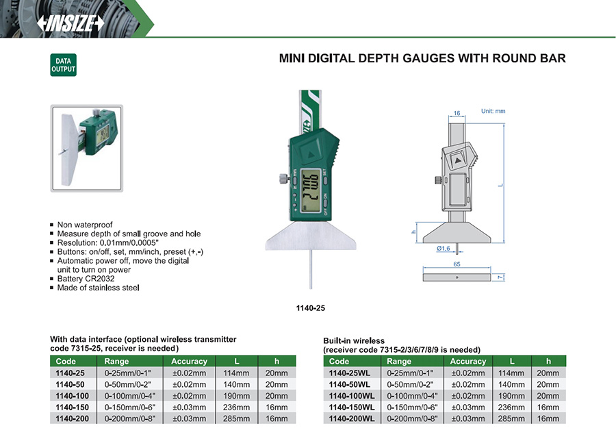 | 1140-25WL | 0-25mm/0-1" | ±0.02mm | 0.01mm/0.0005" | built-in wireless |