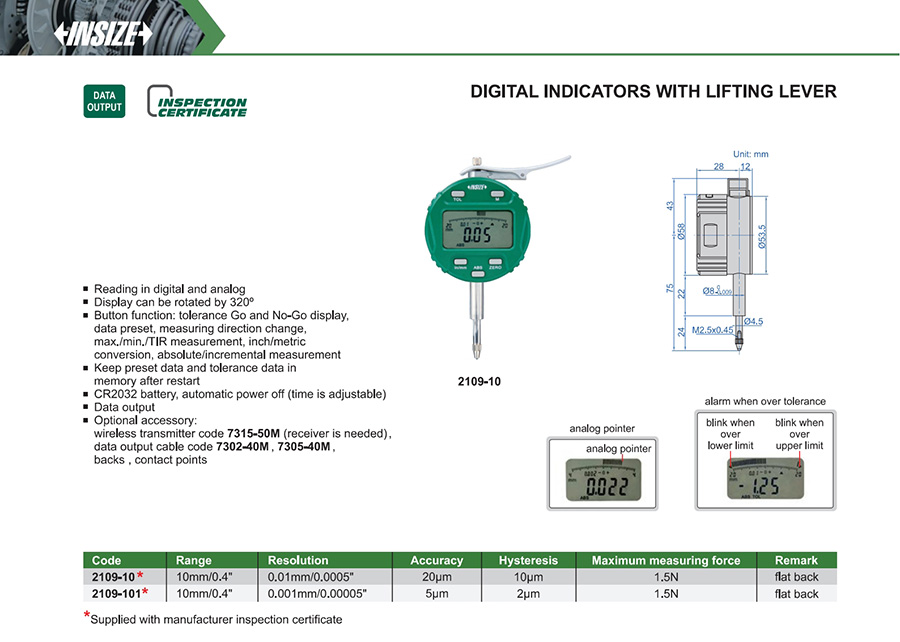 Button function: tolerance Go and No-Go display, data preset, measuring direction change, max./min./TIR measurement, inch/metric conversion,absolute/incremental measurement