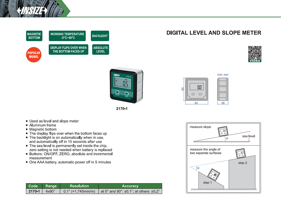 | 2170-1 | 4x90° | at 0° and 90°: ±0.1°; at others: ±0.2° | 0.1° (=1.745mm/m) | no |
