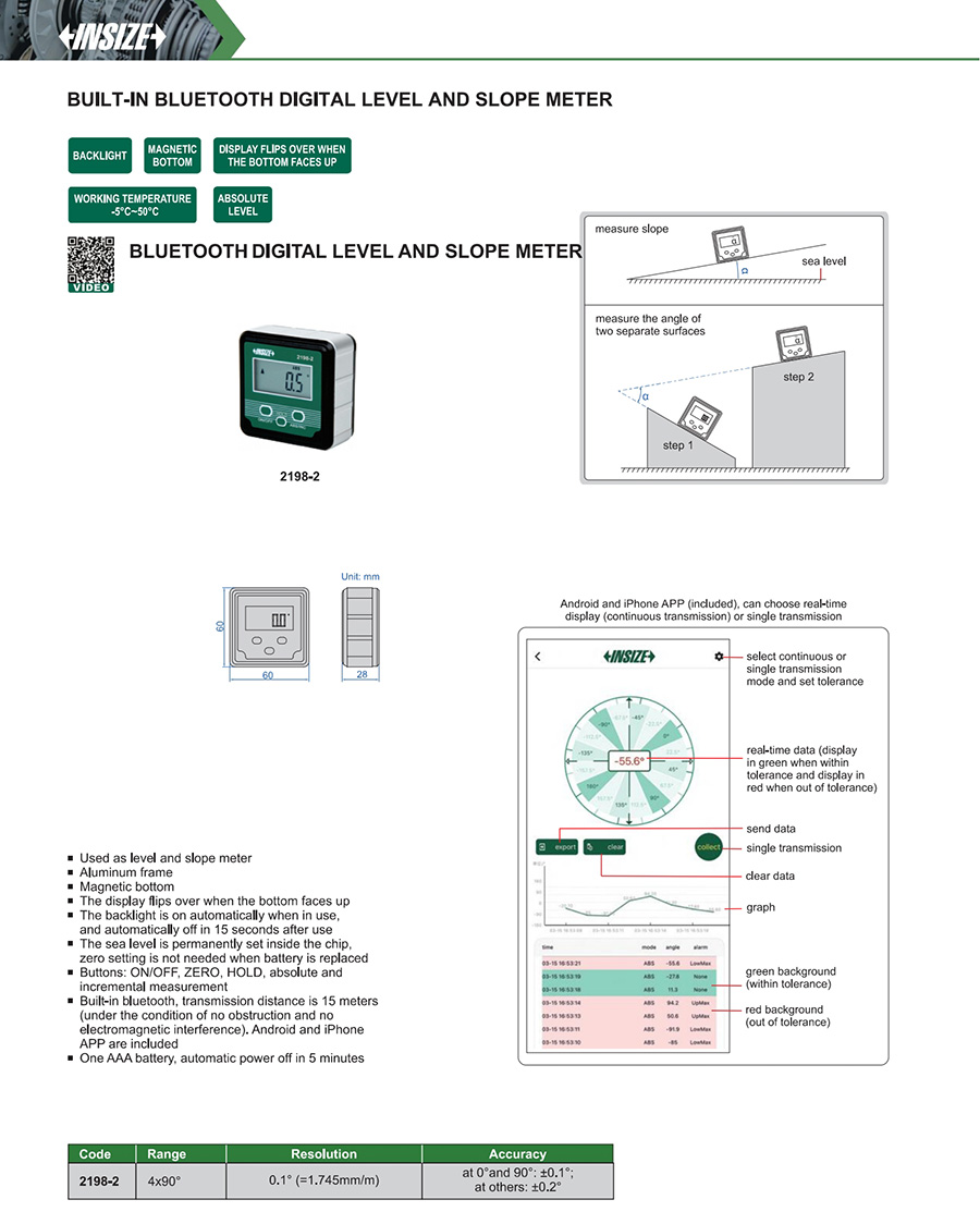 | 2198-2 | 4x90° | at 0° and 90°: ±0.1°;at others: ±0.2° | 0.1° (=1.745mm/m) | yes |