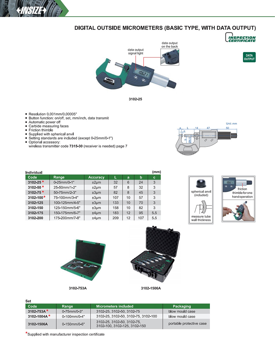 3102-25 0-25mm/0-1" ±2μm 0.001mm/0.00005"