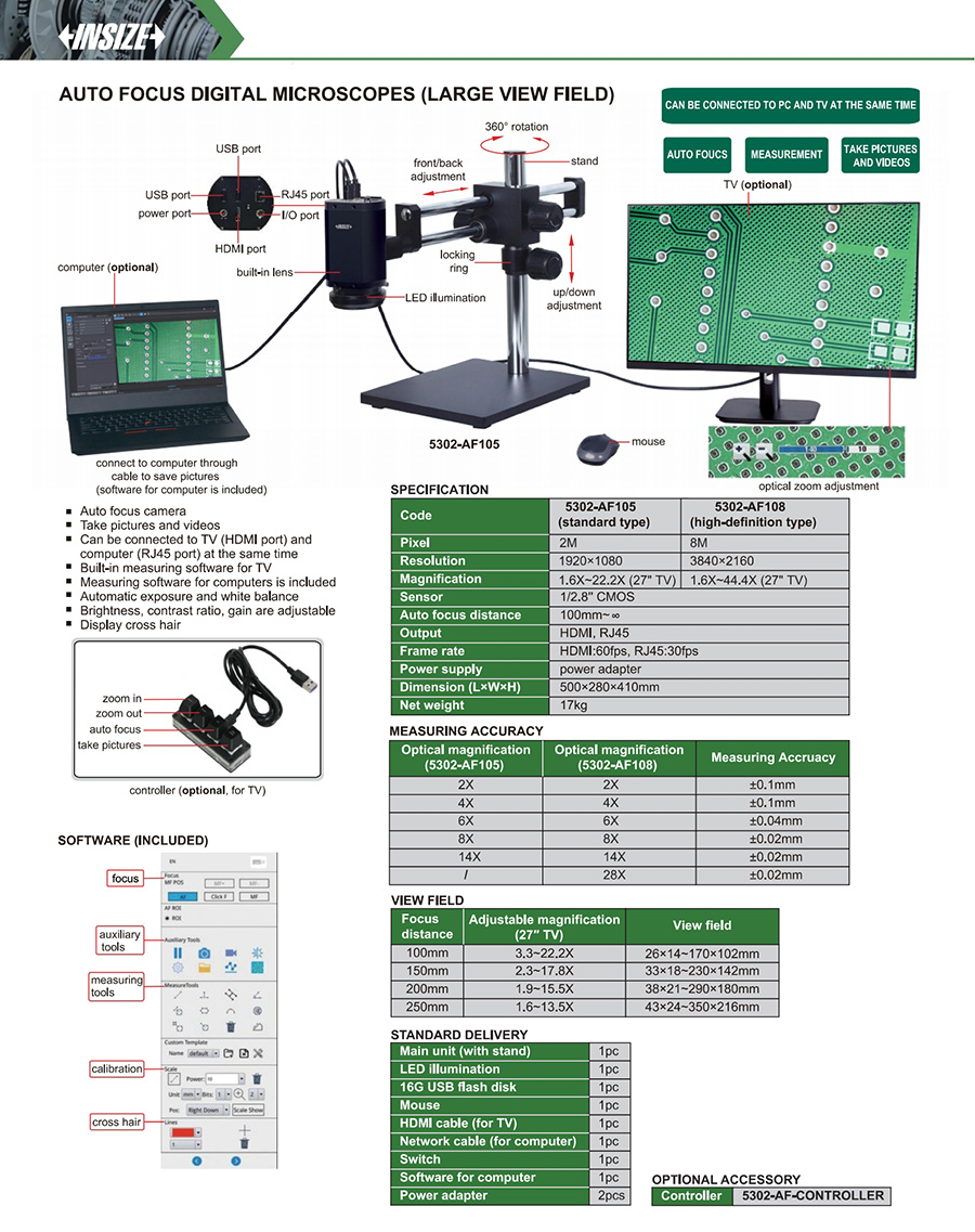 | 5302-AF108 | auto focus digital microscopes | 1.6X~22.2X (27" TV) | 26×14~170×102mm, 33×18~230×142mm, 38×21~290×180mm, 43×24~350×216mm | 8M |