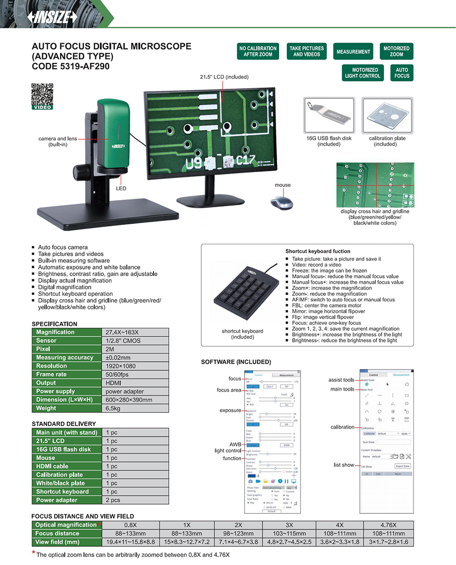 | 5319-AF290 | auto focus digital microscopes | 27.4X~163X | 19.4×11~15.8×8.8, 15×8.3~12.7×7.2, 7.1×4~6.7×3.8, 4.8×2.7~4.5×2.5, 3.6×2~3.3×1.8, 3×1.7~2.8×1.6 | 2M |