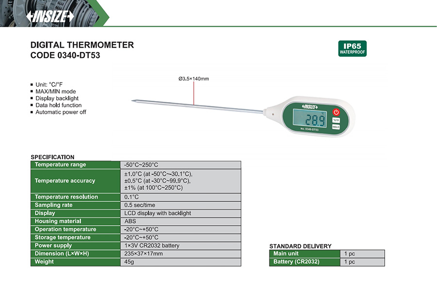 | 0340-DT53 | thermistor | ±1.0°C (at -50°C~-30.1°C), ±0.5°C (at -30°C~99.9°C), ±1% (at 100°C~250°C) | -50°C~250°C |