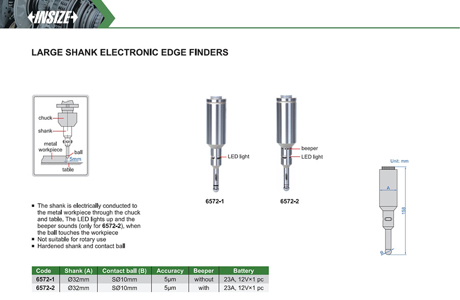 The shank is electrically conducted to the metal workpiece through the chuck and table. The LED lights up and the beeper sounds (only for 6572-2), when the ball touches the workpiece