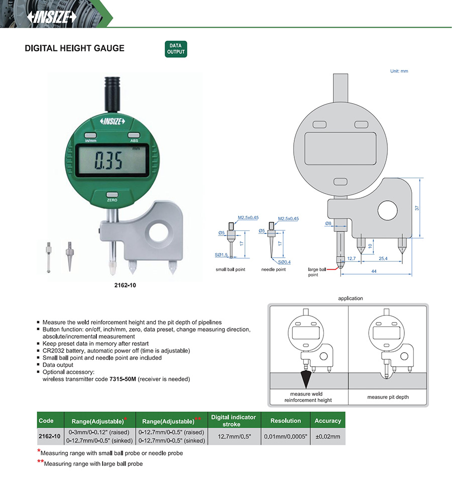 2162-10 0-3mm/0-0.12" (raised), 0-12.7mm/0-0.5" (sinked) ±0.02mm 0.01mm/0.0005"