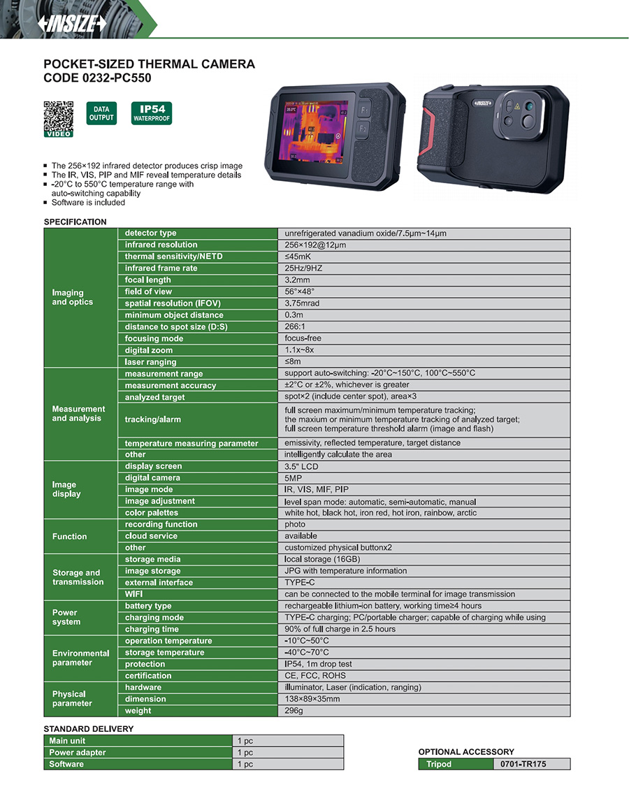 0232-PC550 support auto-switching: -20°C~150°C, 100°C~550°C 256×192@12µm focus-free no