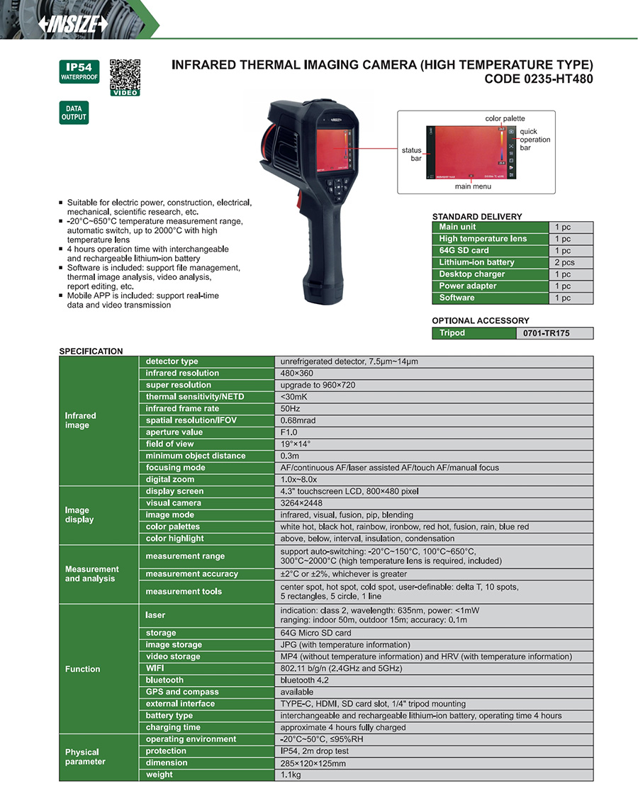| 0235-HT480 | support auto-switching: -20°C~150°C, 100°C~650°C, 300°C~2000°C (high temperature lens is required, included) | 480×360 | AF/continuous AF/laser assisted AF/touch AF/manual focus | yes |
