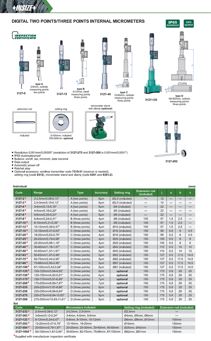 | 3127-75 | 62-75mm/2.44-2.95" | 5μm | 0.001mm/0.00005" |
