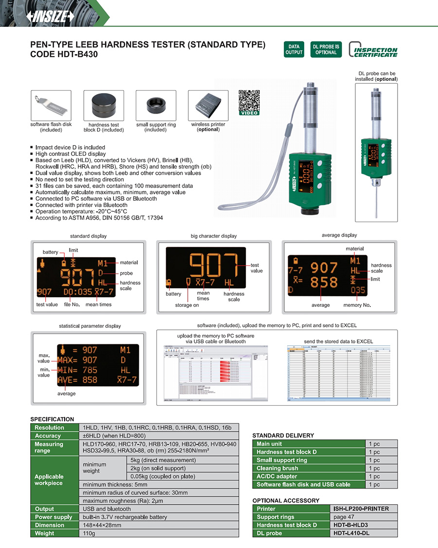 HDT-B430 HLD170-960, HRC17-70, HRB13-109, HB20-655, HV80-940, HSD32-99.5, HRA30-88, σb (rm) 255-2180N/mm² built-in 3.7V rechargeable battery