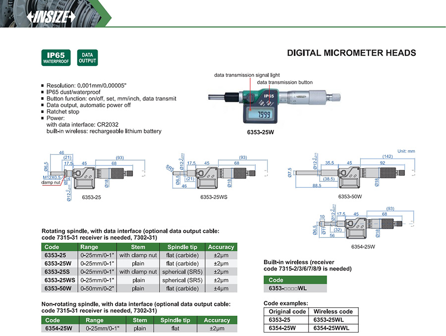 6353-25WS Rotating spindle 0-25mm/0-1" ±2μm 0.001mm/0.00005" plain spherical (SR5)