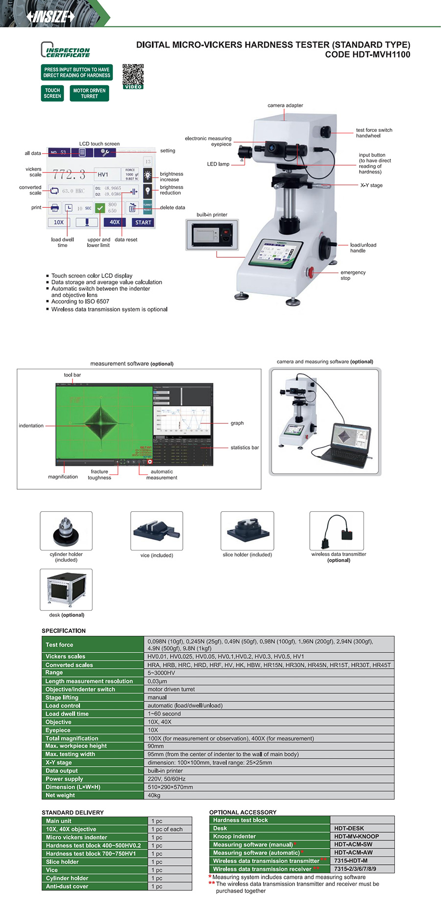 HDT-MVH1100 automatic (load/dwell/unload) 90mm 95mm HV0.01~HV1 100X (for measurement or observation), 400X (for measurement)