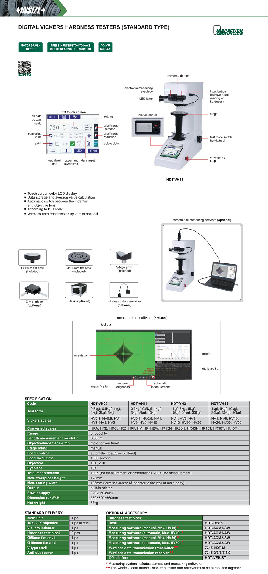 HDT-VH51 automatic (load/dwell/unload) 175mm 135mm HV1~HV50 100X (for measurement or observation), 200X (for measurement)