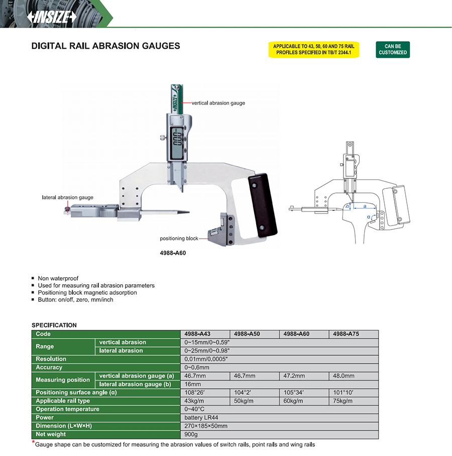 | 4988-A75 | vertical abrasion: 0~15mm/0~0.59", lateral abrasion: 0~25mm/0~0.98" | 0~0.6mm | 0.01mm/0.0005" |