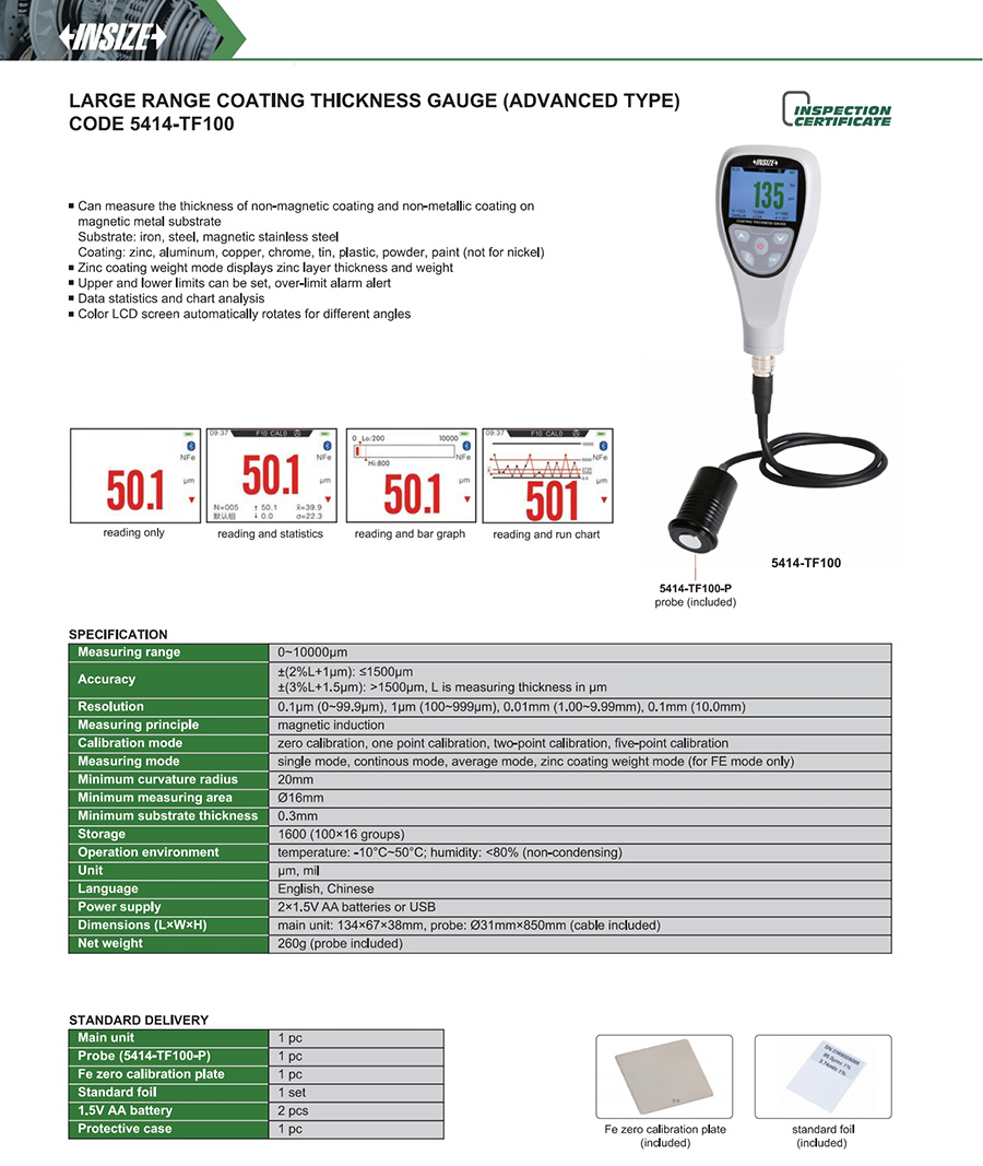 5414-TF100 0~10000µm ±(2%L+1µm): ≤1500µm, ±(3%L+1.5µm): >1500µm 0.1μm (0~99.9μm), 1μm (100~999μm), 0.01mm (1.00~9.99mm), 0.1mm (10.0mm) no