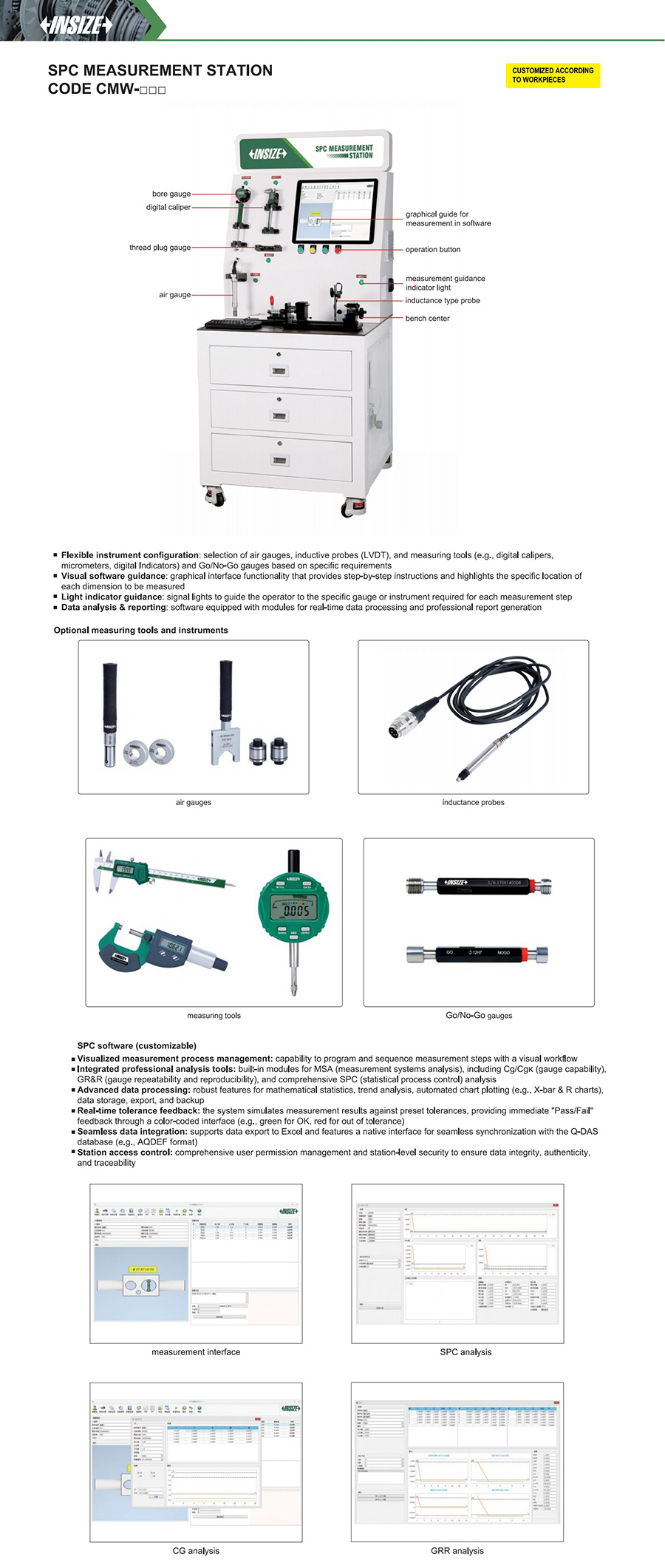 Flexible instrument configuration: selection of air gauges, inductive probes (LVDT), and measuring tools (e.g., digital calipers, micrometers, digital Indicators) and Go/No-Go gauges based on specific requirements