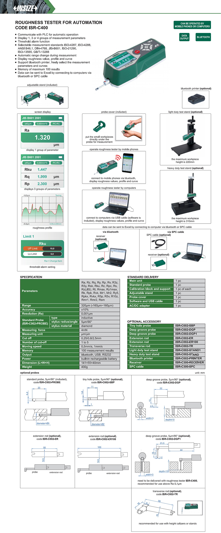 | ISR-C400 | 320μm (-160μm~160μm) | 4mN | 5µm/90° | bluetooth, USB, RS232 |
