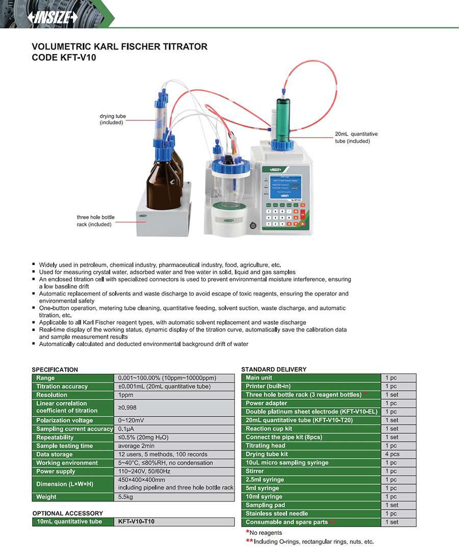 | KFT-V10 | 0.001~100.00% (10ppm~10000ppm) | Titration accuracy: ±0.001mL (20mL quantitative tube) | 1ppm |