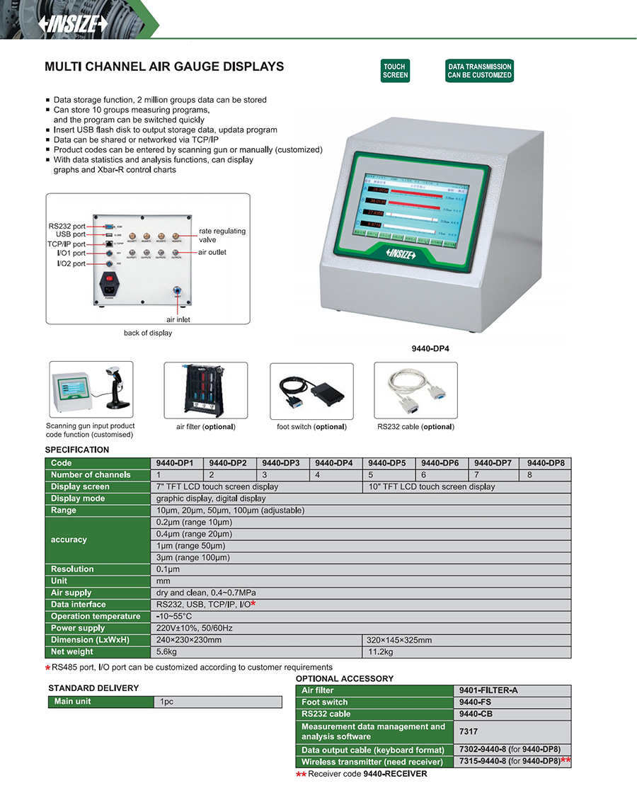 | 9440-DP4 | 10μm, 20μm, 50μm, 100μm (adjustable) | 0.2μm (range 10μm), 0.4μm (range 20μm), 1μm (range 50μm), 3μm (range 100μm) | 0.1μm |
