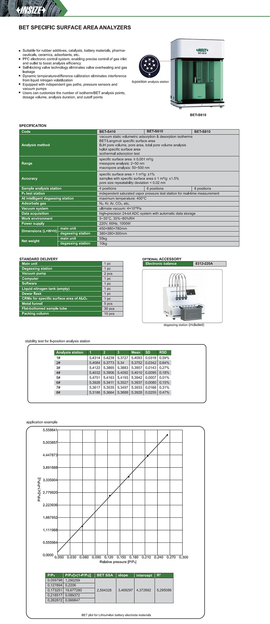 BET-S410 SSA: ≥0.001m2/g, meso: 2~50nm, macro: 50~500nm SSA: > 1 m²/g: ±1%, SSA≤ 1 m²/g: ±1.5%, repeatability of Dp:< 0.02 nm 4 positions