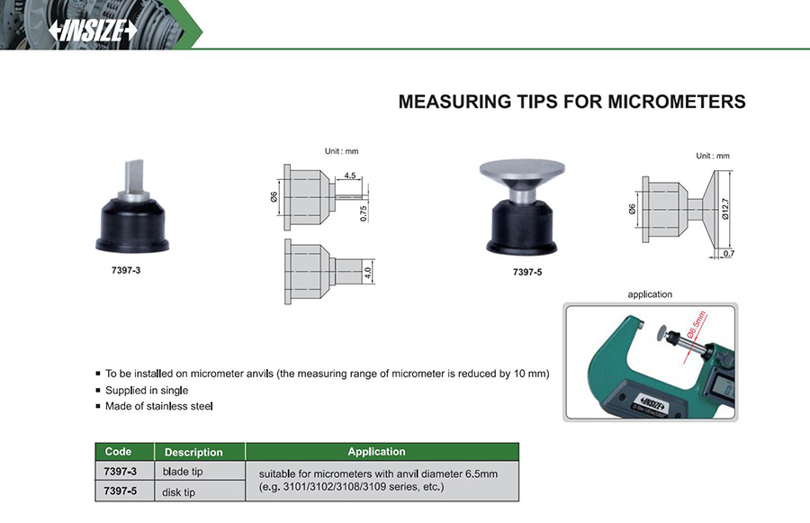 To be installed on micrometer anvils (the measuring range of micrometer is reduced by 10mm)