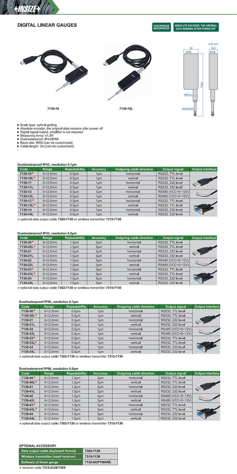 7130-24L optical grating 0-12.5mm 3µm RS232, 232 level vertical