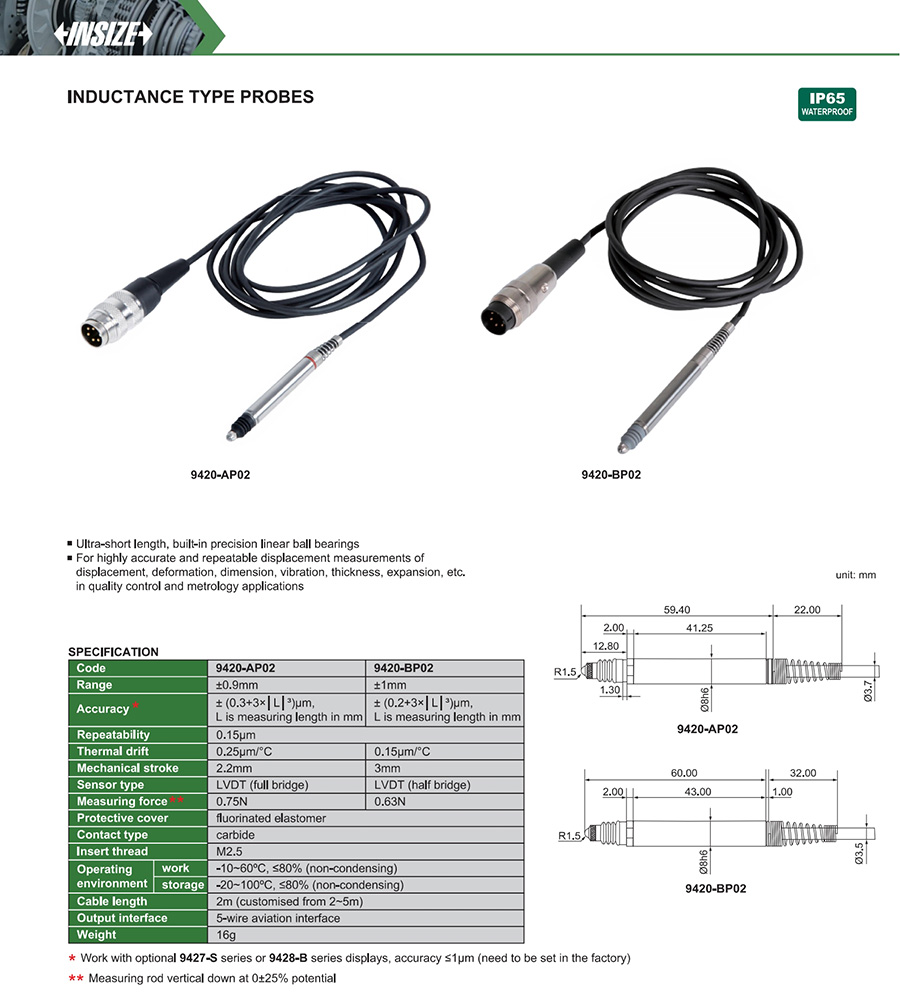 | 9420-AP02 | inductance | lvdt (full bridge) | ±0.9mm | ±0.3+3×│L│³μm, (L is measuring length in mm) |