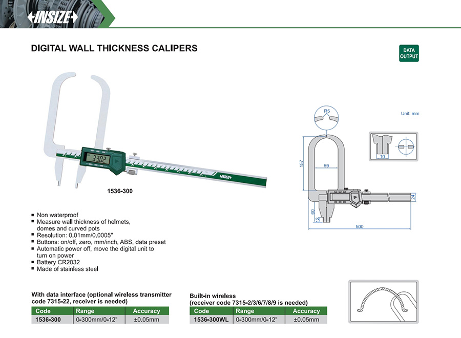 | 1536-300WL | 0-300mm/0-12" | ±0.05mm | 0.01mm/0.0005" | built-in wireless |