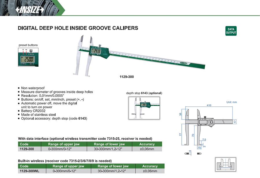 1129-300 0-300mm/0-12" 30-300mm/1.2-12" ±0.06mm 0.01mm/0.0005" with data interface