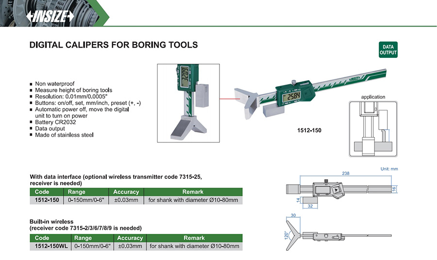| 1512-150WL | 0-150mm/0-6" | ±0.03mm | 0.01mm/0.0005" | built-in wireless |