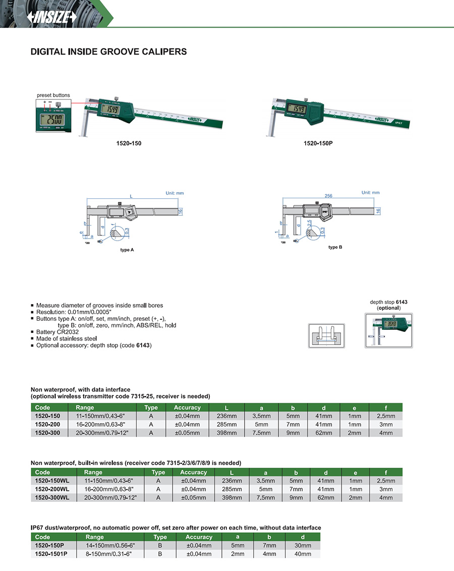 | 1520-1501P | B | 8-150mm/0.31-6" | ±0.04mm | 0.01mm/0.0005" | without data interface |