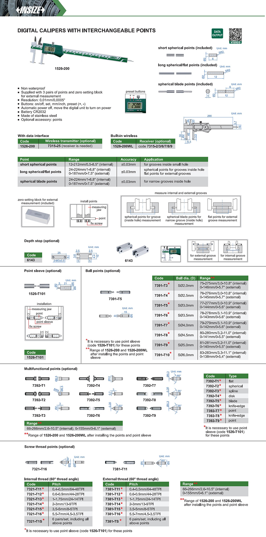 | 1526-200WL | 24-224mm (internal), 0-187mm (external) | ±0.03mm | 0.01mm/0.0005" | Built-in wireless | spherical blade points |