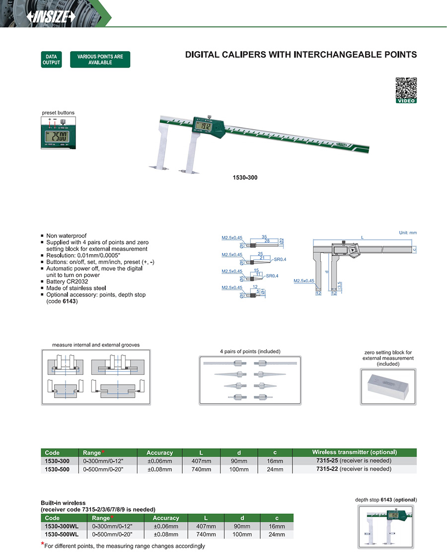 1530-300WL 0-300mm/0-12" ±0.06mm 0.01mm/0.0005" built-in wireless