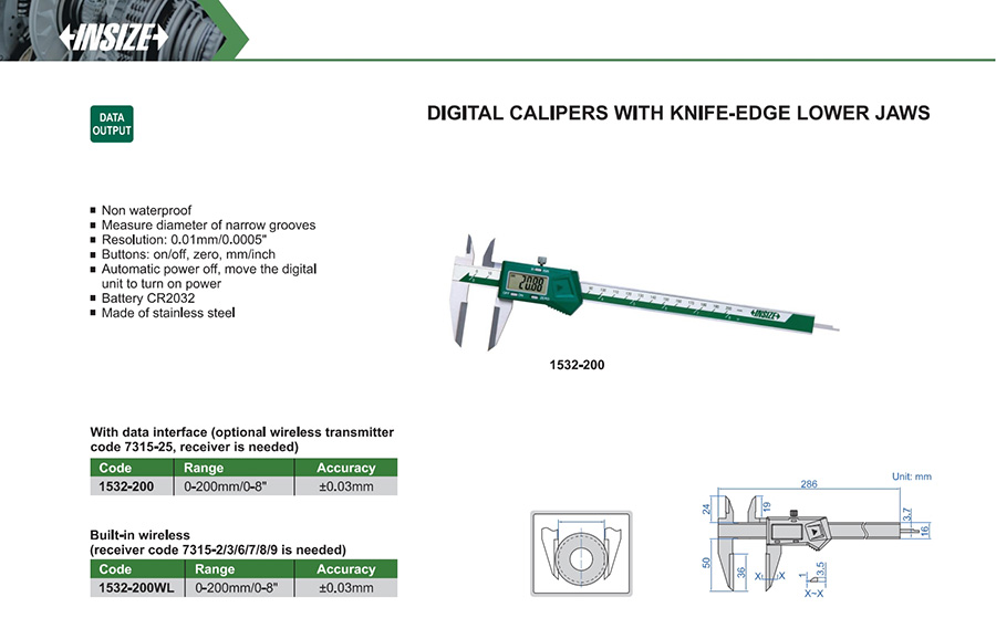 1532-200WL 0-200mm/0-8" ±0.03mm 0.01mm/0.0005" built-in wireless