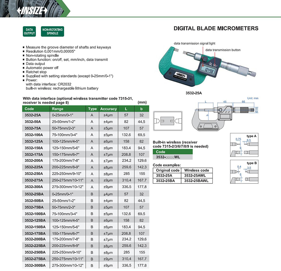 3532-100BAWL B 75-100mm/3-4" ±5μm 0.001mm/0.00005" built-in wireless