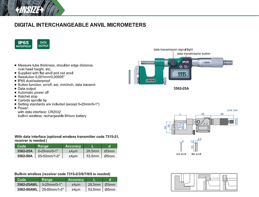 | 3562-50A | 25-50mm/1-2" | ±4μm | 0.001mm/0.00005" | with data interface |