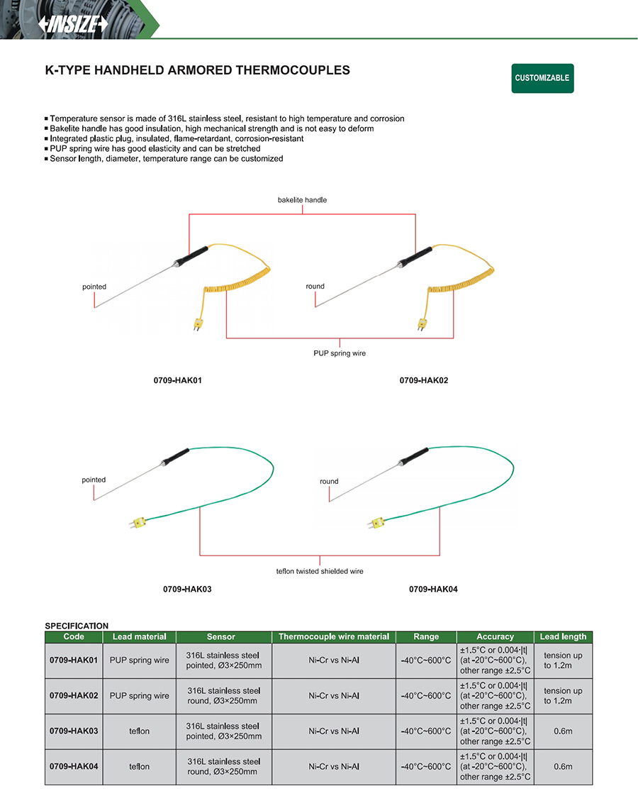 | 0709-HAK01 | K | 316l stainless steel pointed, ø3×250mm | -40°C~600°C | ±1.1°C or .004∙|t| | lead: tension up to 1.2m | lead: PUP spring wire |