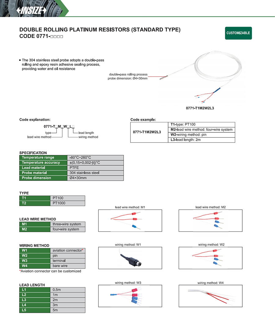 | 0771-□□ | PT100, PT1000 | platinum resistor | -80°C~260°C | ±(0.15+0.002∙|t|)°C |