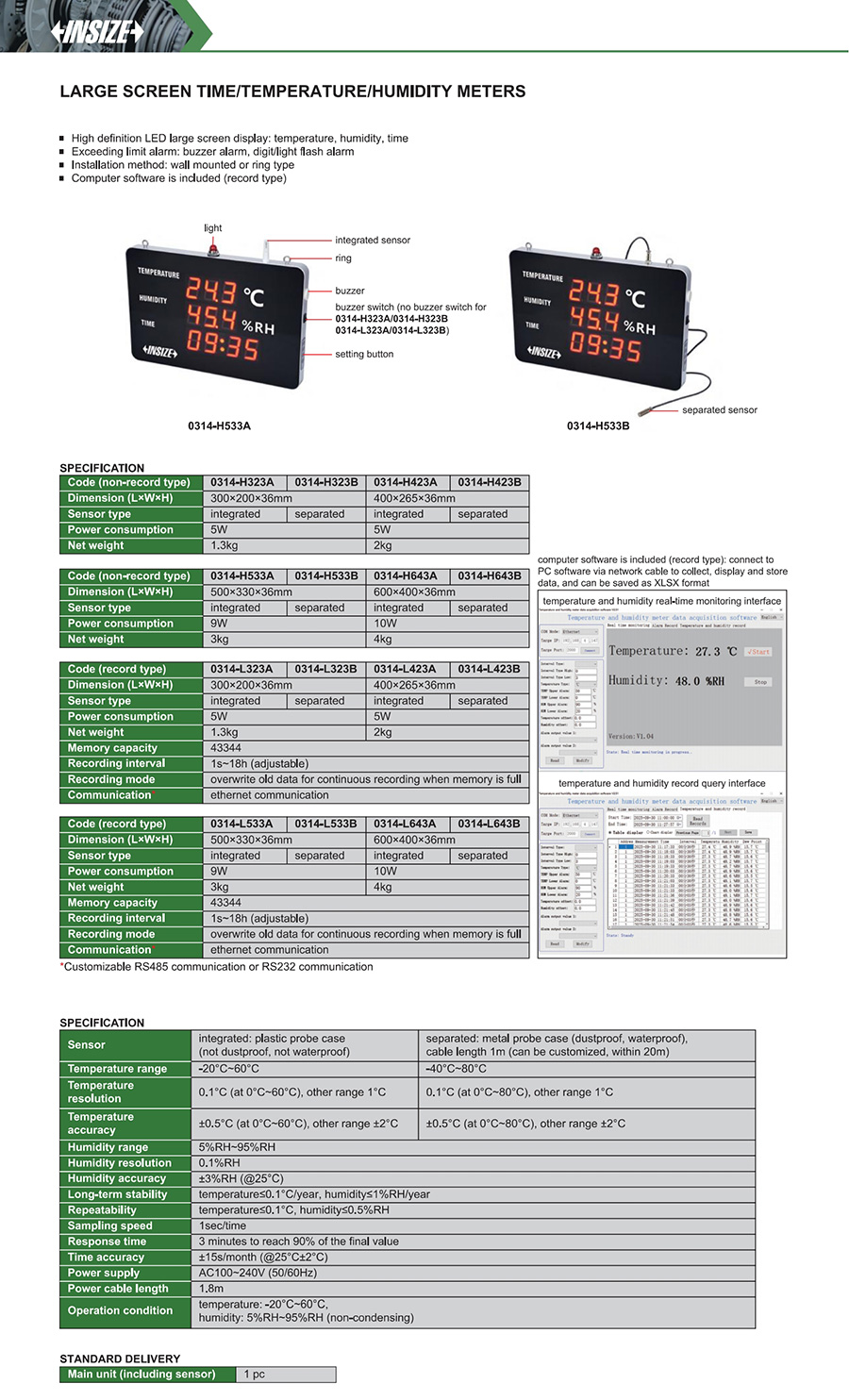 0314-H323A digital integrated 300×200×36mm ±0.5°С (at 0°С~60°С), other range ±2°С 5%RH~95%RH ±3%RH (@25°С) - yes -20°С~60°С