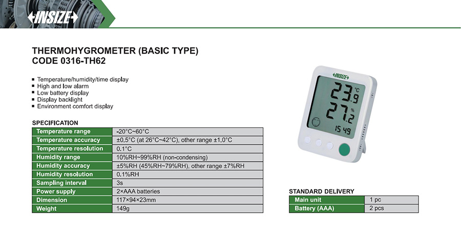 0316-TH62 digital internal ±0.5°C (at 26°C~42°C), other range ±1.0°C 10%RH~99%RH (non-condensing) ±5%RH (45%RH~79%RH), other range ±7%RH yes -20°C~60°C